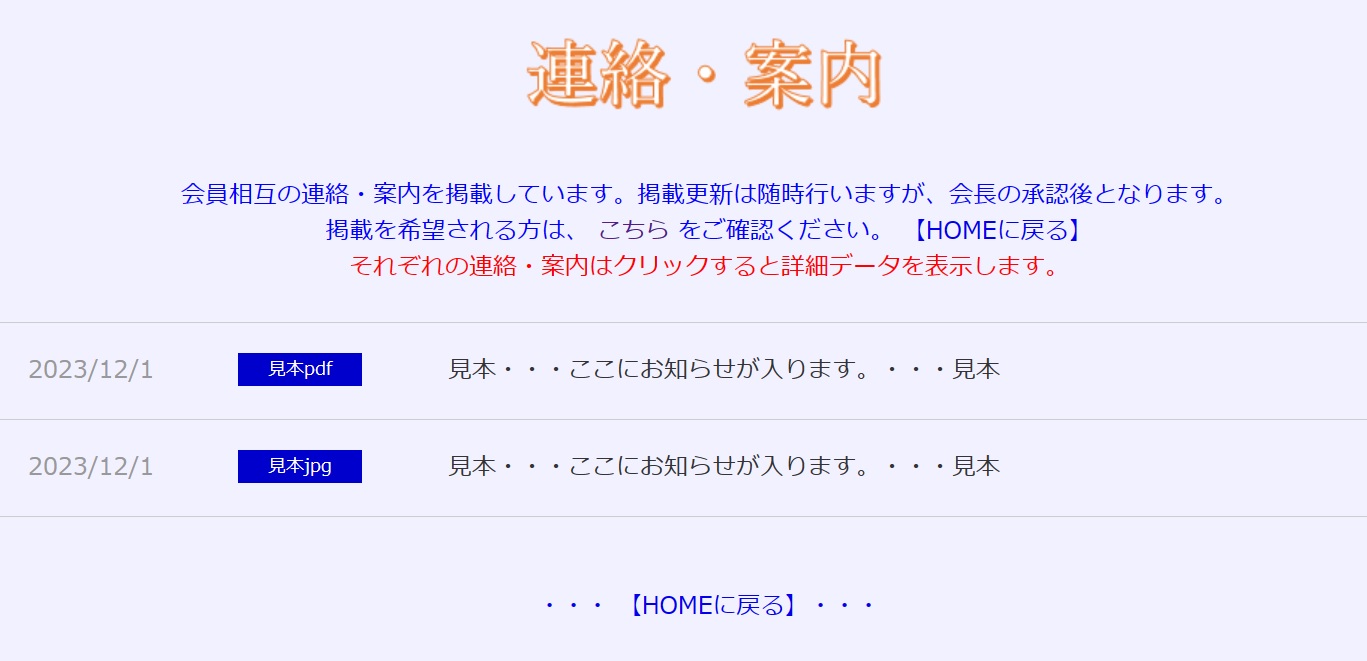 会員相互の連絡・案内を掲載しています。掲載更新は随時行いますが、会長の承認後となります。